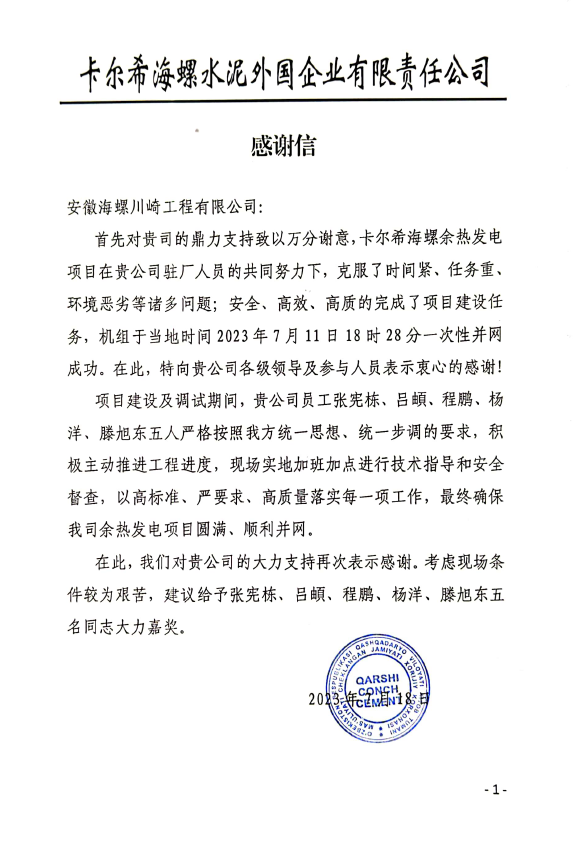 2023年7月18日,卡希爾海螺向海川工程公司發來感謝信。感謝他們在2023年上半年,對卡希爾海螺余熱發電項目工程建設期間全力支持。建設期間安排經驗豐富的項目經理駐廠根據業主并網節點計劃積極主動推進工程建設進度,調試試運行期間又增派幾名專業技術人員參與調試,加班加點,克服建設期間重重困難,最終于2023年7月11日18時28分一次性并網成功。