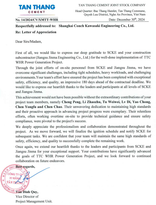 2024年12月30日,越南TTC余熱發(fā)電項(xiàng)目業(yè)主向海川工程公司及施工分包商(江蘇金馬)發(fā)來(lái)感謝信。感謝他們?cè)?024年,對(duì)越南TTC余熱發(fā)電項(xiàng)目工程建設(shè)期間全力支持。建設(shè)期間安排經(jīng)驗(yàn)豐富的項(xiàng)目經(jīng)理及優(yōu)質(zhì)的施工單位駐廠,根據(jù)業(yè)主施工節(jié)點(diǎn)計(jì)劃積極主動(dòng)推進(jìn)工程建設(shè)進(jìn)度,搶抓現(xiàn)場(chǎng)施工,調(diào)試期間又增派幾名專業(yè)技術(shù)人員參與調(diào)試,加班加點(diǎn),克服建設(shè)期間重重困難,最終該項(xiàng)目施工階段較營(yíng)業(yè)合同約定工期提前約180天完成。